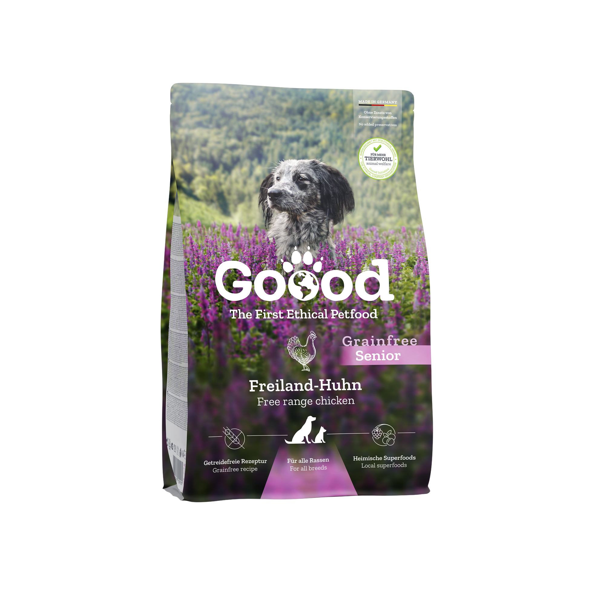 Easily digestible complete food with chicken for medium and large senior dogs Chickens are scratching and pecking in the wild. Just like our free range chickens. Chicken is packed with protein and iron and trout are high in essential fatty acids. There are also potatoes, carrots and parsnips from regional farms.
